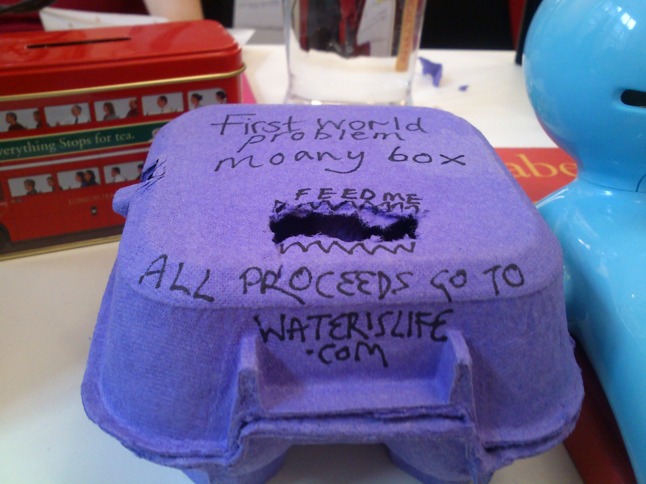 So for the last few weeks, every time we find ourselves doing a first world moan, we put money in the moany box. Anyone in the office is allowed to enter. Then every few months, we count up the money and pay it in directly to WaterisLife.com