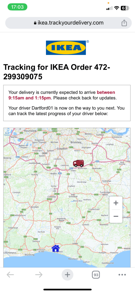 7 May, 11am: I move all the furniture in the flat around to make space so can no longer reach my writing desk but hey it’s only for a few hours! I get a text to say the new time window. I enjoy watching the updates of the little truck avatar, showing me where the driver is on the map of Britain.