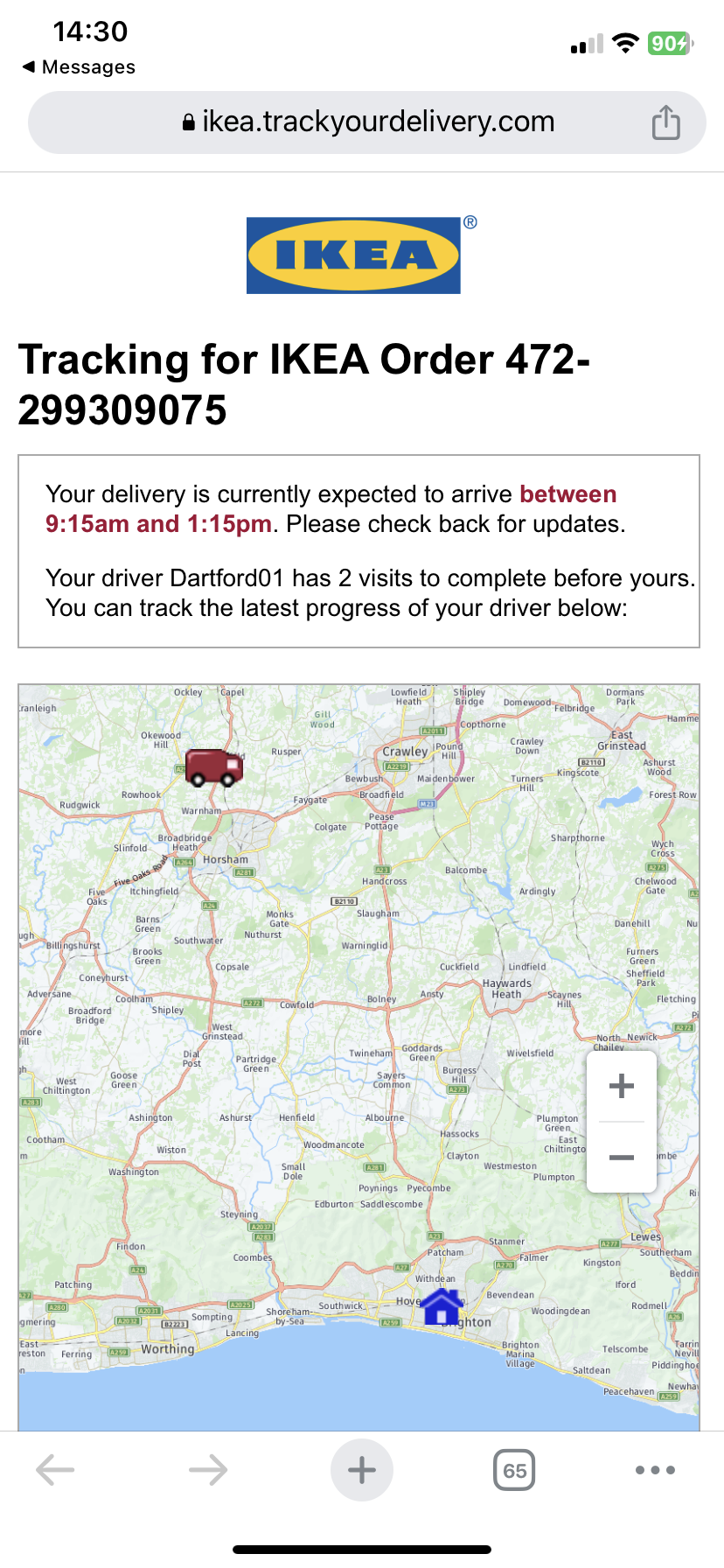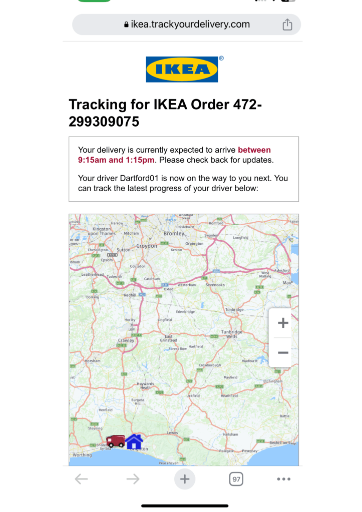 4.25pm: Check the app. The truck is now not 2 streets away but is in Burgess Hill. Moments later, he seems to be headed north on the M25… ? The Taskrabbit reason that maybe he’s forgotten the sofa and has nipped back to Ikea to get it? We wait.