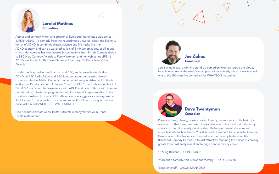 Was super honoured to take part in day 2 of this global ADHD virtual conference with so many excellent speakers, chatting about how to laugh & live with ADHD, along with comics Dave Twentyman and co-creator Lauren Taylor, before the ADHD Foundation screened my 30 min comedy Life In ADHD on Thurs 20 October 2021.