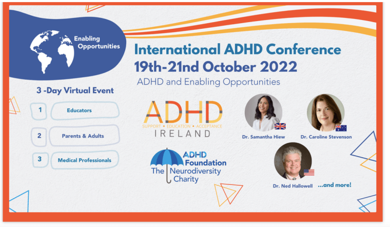 This international, virtual event will run from the 19th-21st October 2022, with a different target audience for each day. Join us to hear from the world’s greatest speakers on ADHD, such as Dr Ned Hallowell, Dr Caroline Stevenson, Dr Samantha Hiew, Dr Blánaid Gavin, Dr Tony Lloyd, Dr Peter Mason and more.”